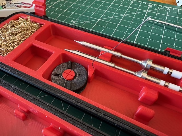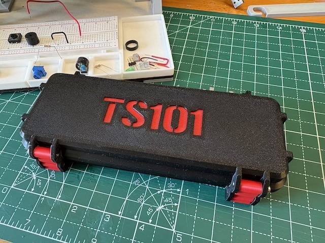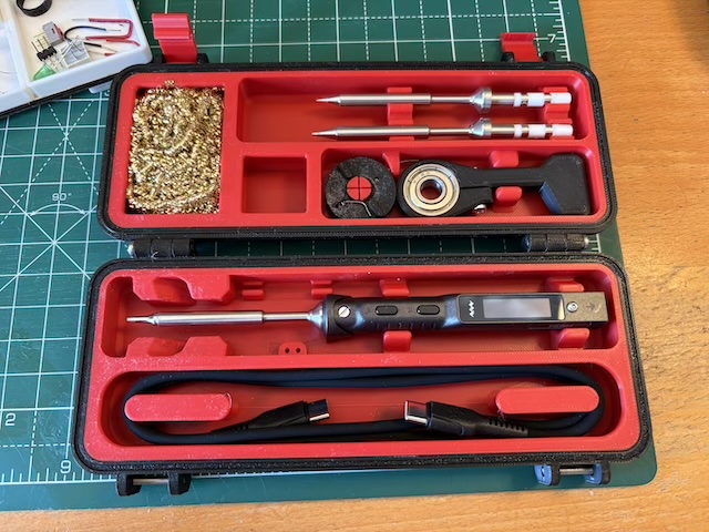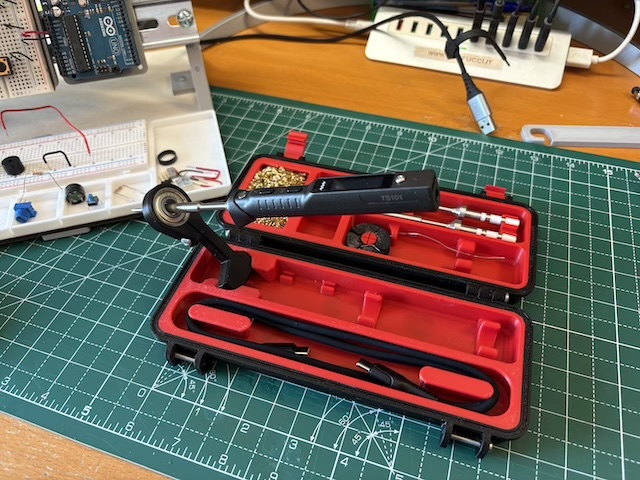 Un contenitore stampato 3D risulta molto utile, ciò evita di utilizzare la scatola di cartone con cui vi viene venduto il saldatore. Il contenitore che ho stampato è una custodia rugged multi-scomparto, pensata specificamente per TS100/TS101, e derivata (remix) da un progetto precedente che trovate seguendo il link allegato.