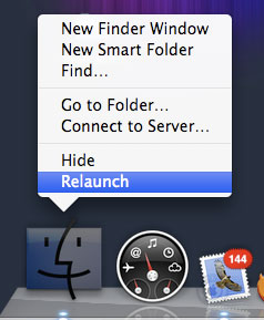 2. oppure direttamente dal Dock, premere il pulsante opzione (alt), fate click mantenendo premuto il pulsante del mouse sull’icona del Finder nel Dock, selezionate “Relaunch”.