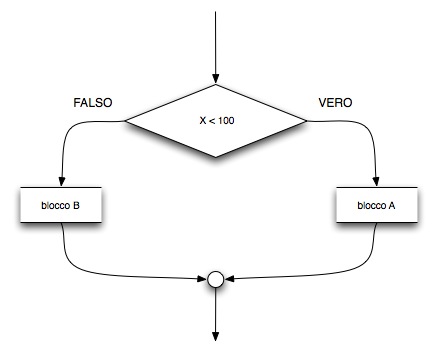 Se la condizione X<100 è vera viene eseguito il blocco di istruzioni del “blocco A”, se la condizione X<100 è falsa viene eseguito il blocco di istruzioni del “blocco B”.