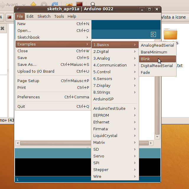 Per verificare il funzionamento apriamo il file di esempio: File -> Examples -> 1.Basics -> Blink: