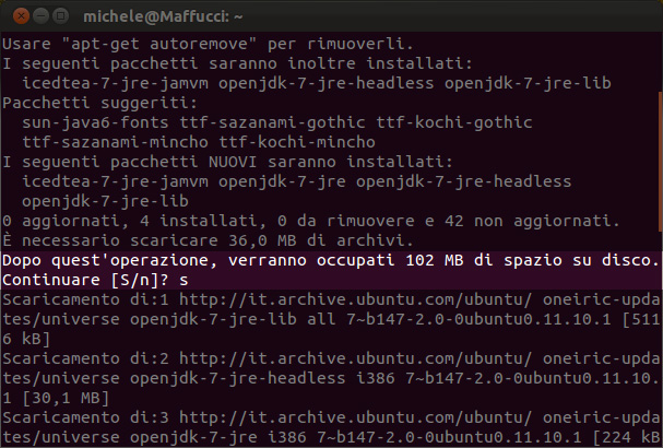 Rispondete “s” quando vi viene chiesto di “Continuare” con l’installazione: