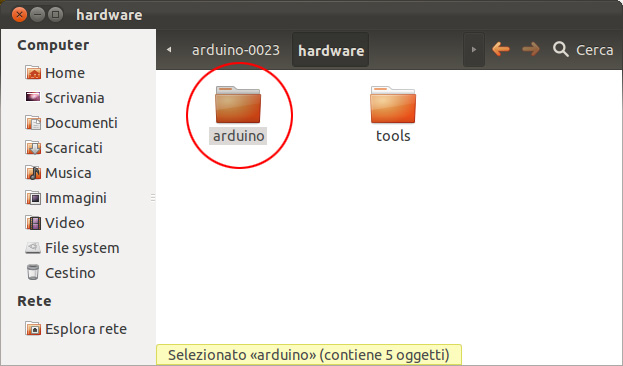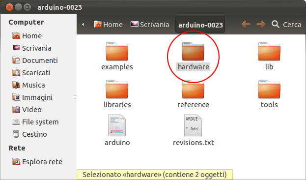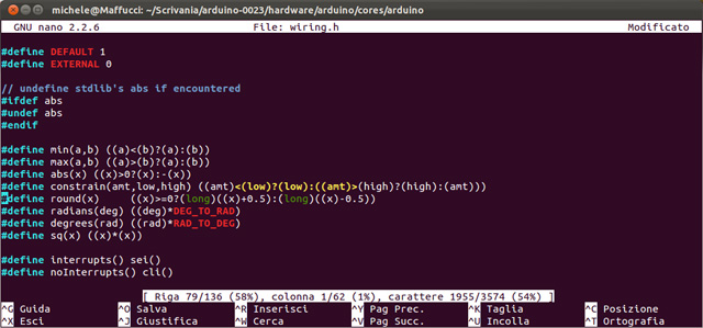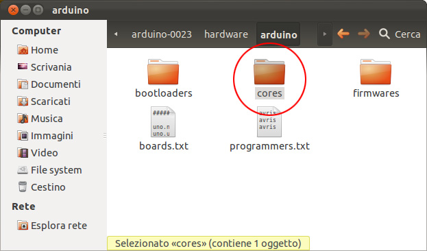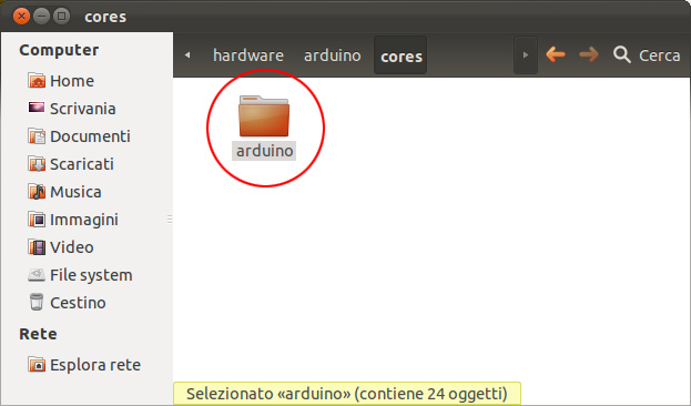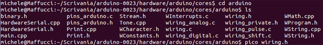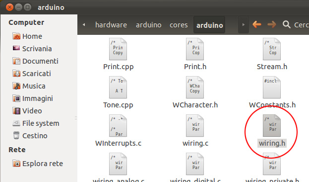 08. per correggere l’errore bisogna aprire il file wiring.h la cui posizione è: /arduino-0023/hardware/arduino/cores/arduino/wiring.h, potete accedervi direttamente usando il terminale oppure aprirlo con il vostro editor di testo preferito. Di seguito le schermate che vi mostrano la posizione di wiring.h nella gerarchia delle cartelle partendo dalla cartella: Arduino 0023: