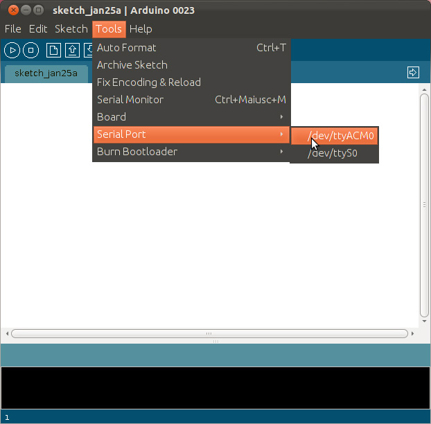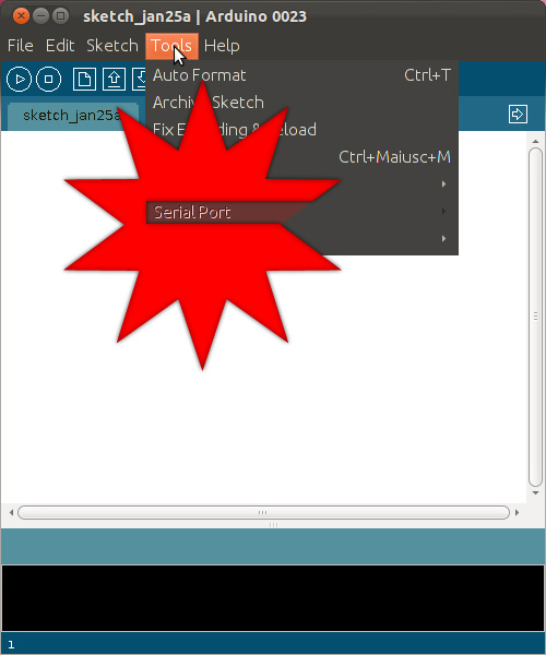 la porta seriale per la programmazione sfortunatamente adesso c’e’ un nuovo Software che ho dovuto scaricarmi Arduino-1.0.3 e come sistema operativo uso Ubuntu 12.04.