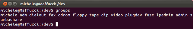 groups permette di conoscere i/il gruppi/o a cui appartiene un utente. Se sul terminale digitate solamente il comando groups vi verrà restituito l’elenco dei gruppi dell’utente col quale si è loggati al sistema.