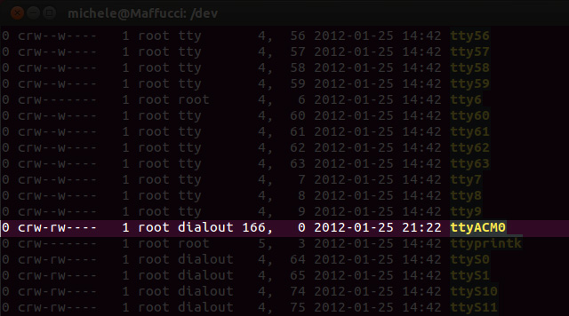 2. andate nella directory /dev e vedete qual’é il gruppo di appartenenza di ttyACM0, nel mio caso “dialout
