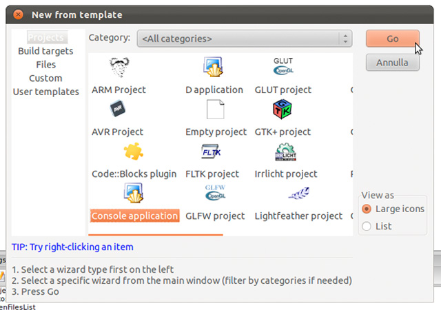 Nella finestra “New from template” selezionate “Console application” e fate click su “Go