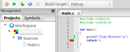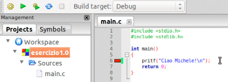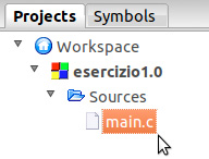 all’interno troverete il file main.c in cui vi sarà il codice C del vostro primo programma. Se desiderate potete variare il nome del file, ma non inserite spazi o caratteri di interpunzione ed inoltre lasciate lestensione .c