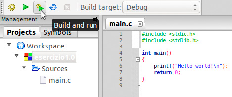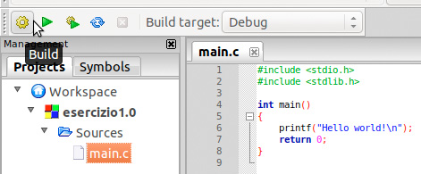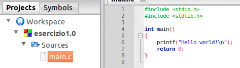 Doppio click sul file main.c visualizzerete una serie di linee di codice standard che costituiscono il primo classico esempio di  programma C: “Hello world!“.