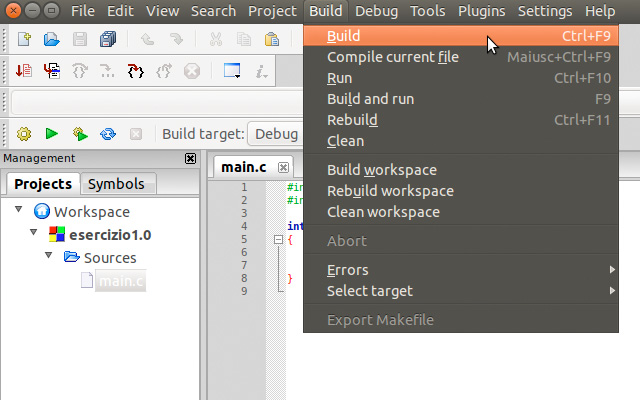 Per compilare un programma potete farlo ho utilizzando la toolbar, facendo click sull’icona ingranaggio, oppure dal menù Build