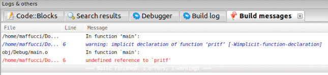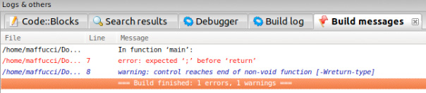 Quando eseguite la compilazione vengono segnalati gli errori sintattici e i warning e il numero di riga dove questi si sono presenti.
