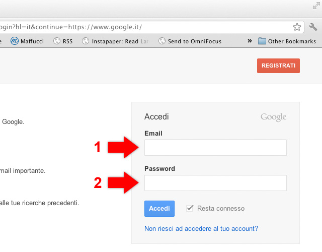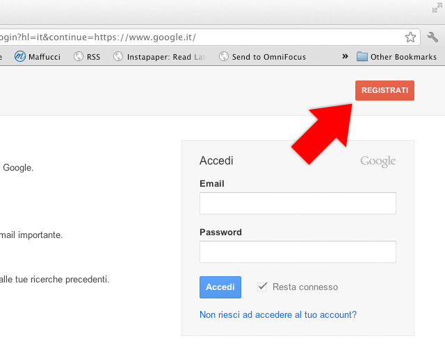 Se non possedete un account Google effettuate la registrazione facendo click su “Registrati”