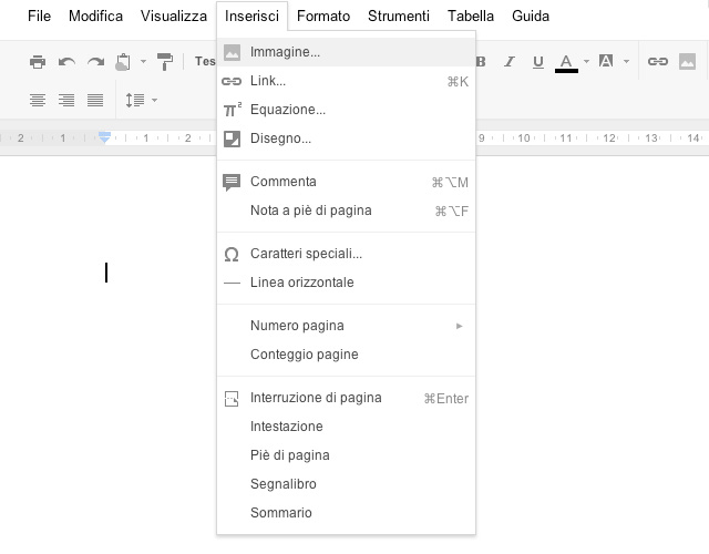 L’inserimento di una immagine avviene dal menù “inserisci” -> “immagine”, verrà aperta una schermata per selezionare l’immagine che si desidera inserire nel documento.