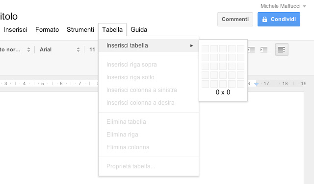 L’inserimento di una tabella avviene selezionando “Tabella” dal menù principale e specificando il numero di righe e colonne desiderato.