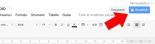 Per condividere il vostro documento con altri utenti fate click sul pulsante in alto a destra “Condividi”.