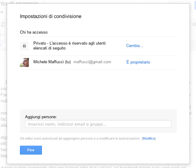 Dal riquadro “aggiungi persone” inserite l’indirizzo e-mail dei collaboratori assegnando il tipo di permesso sul documento: