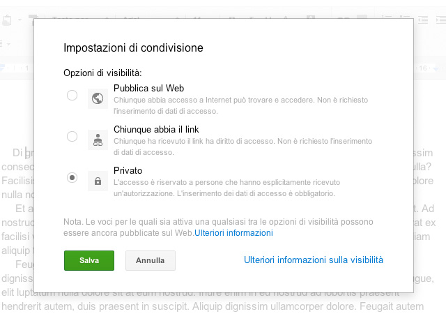 Cliccando condividi si aprirà la schermata delle impostazioni di condivisione e per modificare la visibilità del documento click su Cambia… in questo modo potrete decidere se il documento è visibile su tutto il Web, solo alle persone che hanno ricevuto il link oppure Privato