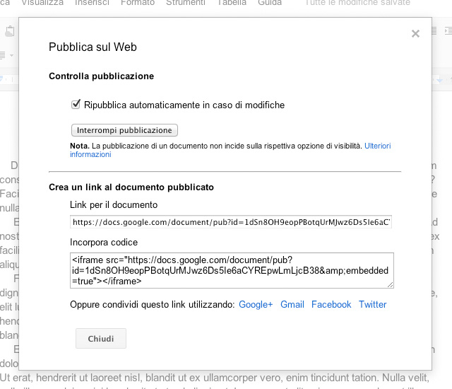 Verrà creata una pagina web del documento che può essere visualizzata solo da chi possiede il link. Le impostazioni di visibilità saranno mantenute secondo quanto impostato (il documento potrà essere privato e pubblicato).
