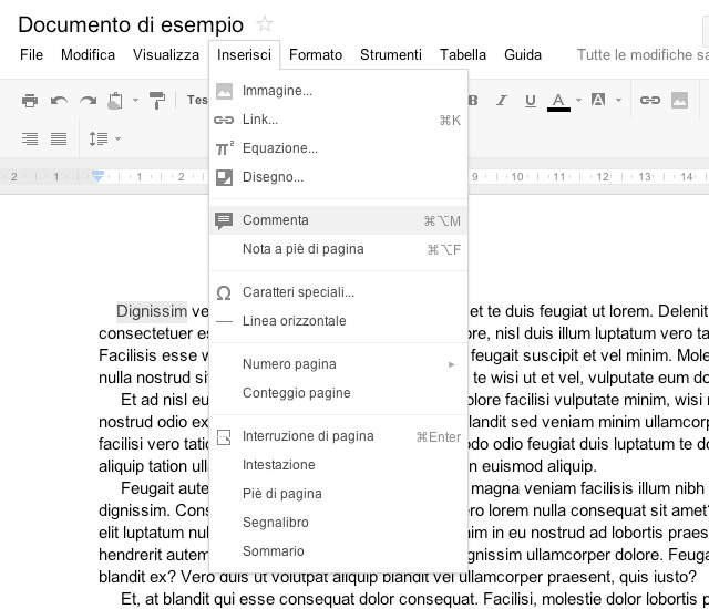 Per commentare il testo da parte vostra e dei vostri collaboratori, posizionate il cursore o evidenziare il testo in cui si desidera venga visualizzato il commento. Dal menù “Inserisci > Commenta” inserite il commento.