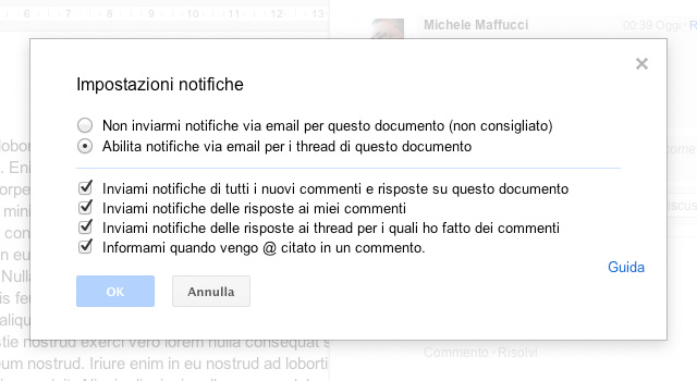 In funzione delle selezioni eseguite sarà possibile ricevere notifiche di tutti i commenti, risposte ai miei commenti, risposte sul documento, solo le risposte ai thread delle risposte degli utenti al mio commento.