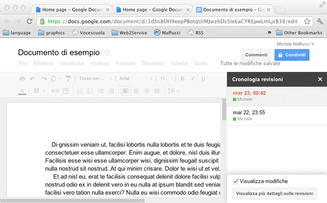 Cliccando su uno degli elementi della “Cronologia revisioni” saranno visualizzate le modifiche effettuate dall’utente identificate con il colore assegnato all’utente.