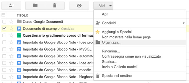Oppure selezionando con il carattere di spunta il documento e dal menù “altri -> organizza…” si aprirà una finestra che mostrerà le cartelle dove spostare i file.