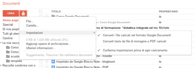 È possibile caricare documenti dal proprio PC su Google Documenti. I documenti caricati potranno essere convertiti nel corrispondente formato Google Documenti.