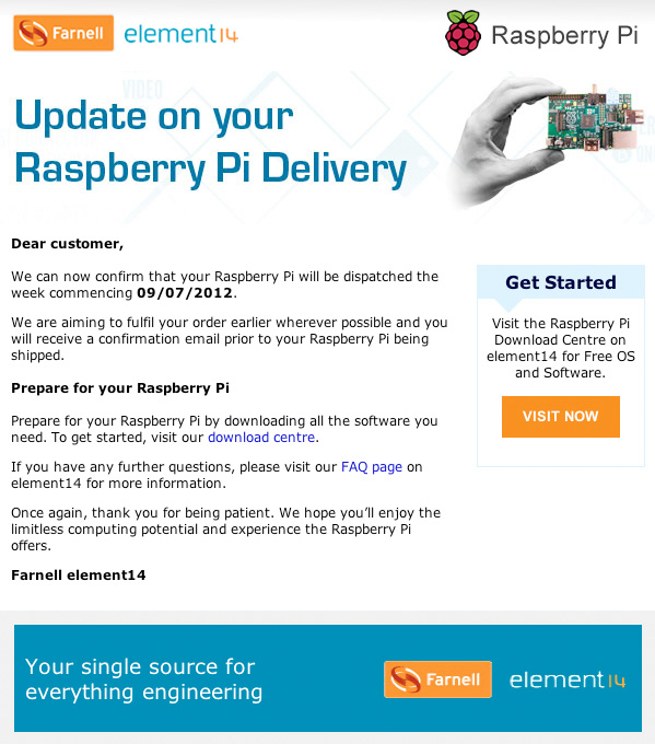 Mi è giunta nel tardo pomeriggio di oggi la mail fa Farnell che mi avverte che dalla settimana del 09/07/2012 mi invierà la scheda. Come si evince dalla mail in allegato le spedizioni incominceranno dalla settimana indicata in avanti, qundi non so ancora la data precisa, attendo mail di conferma spedizione, speriamo che i tempi siano brevissimi e non inizio settembre come per RS.