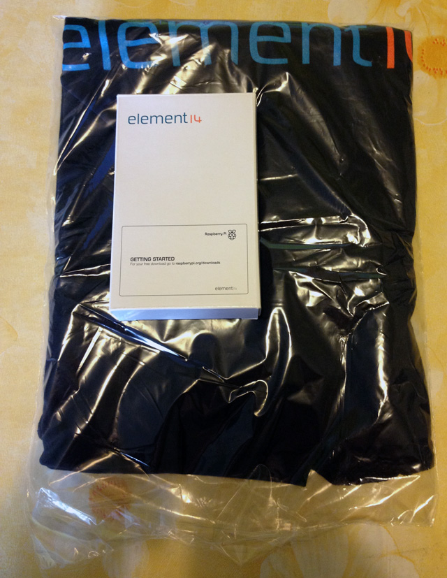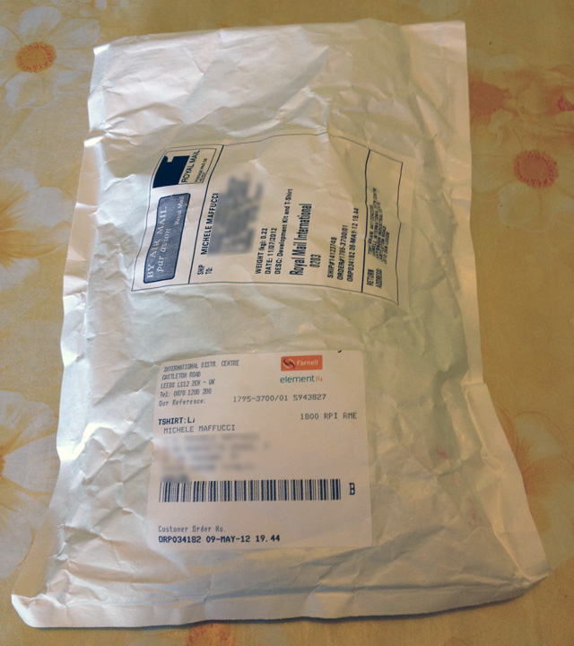 Finalmente dopo tanto attendere oggi è giunto il desiderato 🙂 Raspberry Pi ordinato presso element 14, di seguito le immagini dello spacchettamento, all’interno maglietta e scheda.