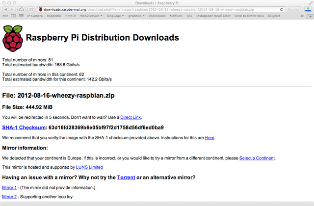 Per l’installazione della distribuzione ufficiale Raspbian potete procedere scaricandola direttamente da http://www.raspberrypi.org/downloads. Selezionate la modalità di download, nell’esempio ho scelto di prelevare direttamente il file .zip