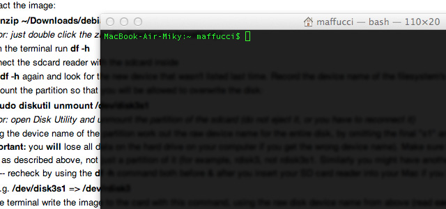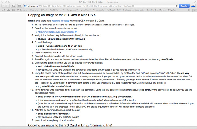Per l’installazione del sistema operativo sulla scheda fate riferimento alla pagina del wiki ufficiale su cui potete trovare le istruzioni dettagli ate per installare il sistema operativo sulla SD utilizzando ogni sistema operativo (Linux, Mac Windows), per questa guida io ho scelto di spiegare come procedere utilizzando Mac OS, in future lezioni dettaglierò l’installazione per altri sistemi operativi, ma la procedura command line è simile per tutti i sistemi operativi.