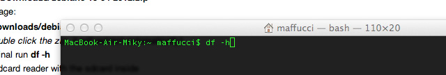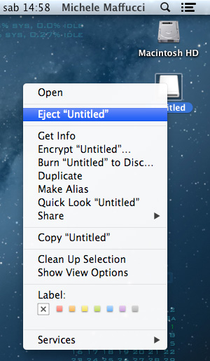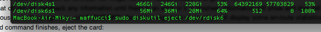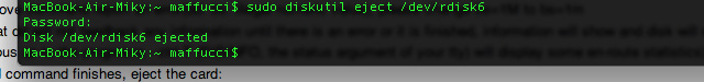 se volete evitare di utilizzare in questa fase il terminale potete più semplicemente fare click con tasto destro sull’icona dell’SD e poi Eject “Untitled”