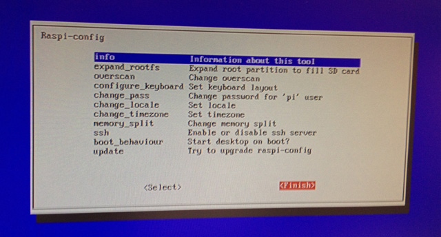 Da questa finestra potrete accedere alla configurazione del vostro “pc ultratascabile” l’analogo del setup di pc desktop standard; analizzeremo questa finestra in una successiva lezione, in ogni caso la configurazione non è difficoltosa, se volete cimentarvi vi consiglio di configurare: tastiera, timezone, e se volete che il Raspberry Pi avvii l’interfaccia grafica al boot selezionando: “boot_behaviour – Strat desktop on boot?”.