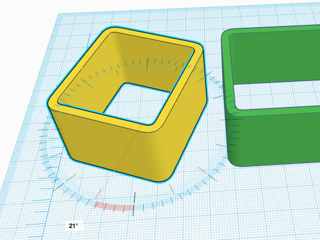 Il primo oggetto creato dovrà essere ruotato di 21° in senso orario, per effettuare rotazioni con precisione al grado dovrete effettuare la rotazione selezionando la maniglia di rotazione parallela al piano di appoggi e ruotandola mantenendo il mouse esternamente al goniometro: