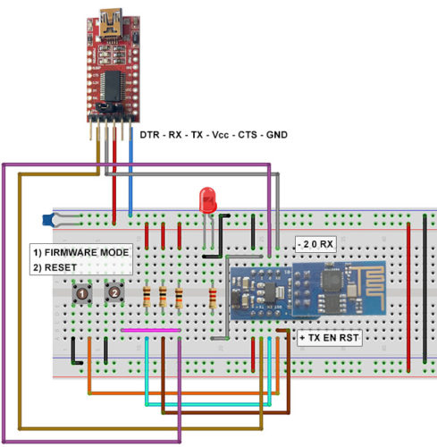 Quando alimentato, l’ESP8266 si avvierà in modalità “operation mode” se GPIO0 è HIGH o si avvierà in modalità “firmware load mode” se GPIO0 è posto a LOW cioè connesso a GND. I due pulsanti che vedete nell’immagine sopra vengono utilizzati per porre l’ESP8266 in una delle due modalità.