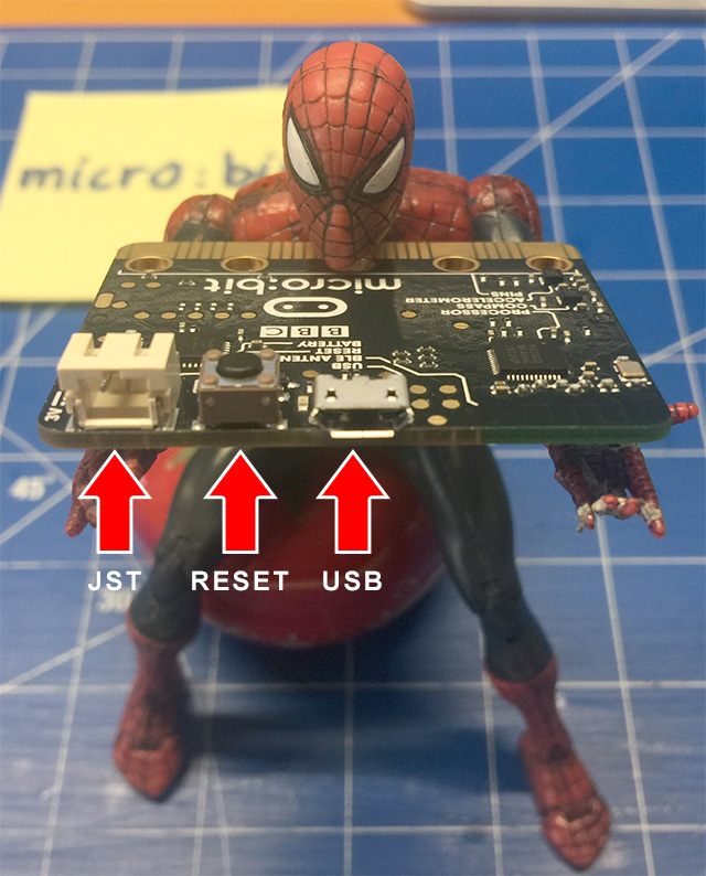 - Un pulsante di reset permette il riavvio della scheda ed esegue l’ultimo programma caricato nella memoria della scheda (non cancella quindi il programma). Il reset è possibile sia nel caso in cui il micro:bit viene alimentato via USB che mediante la batteria esterna.