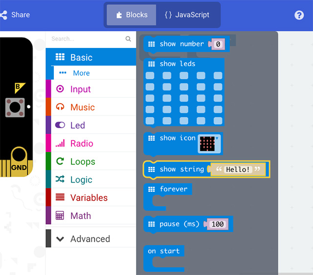 Durante questa prima parte del corso useremo come ambiente di programmazione il Microsoft Block Editor che permette la creazione di codice unendo blocchi funzionali, così come accade con Scratch o Blockly. L’intera programmazione avviene on-line all’interno di una pagina web, inoltre non sarà necessario installare nessuna driver sul vostro computer.