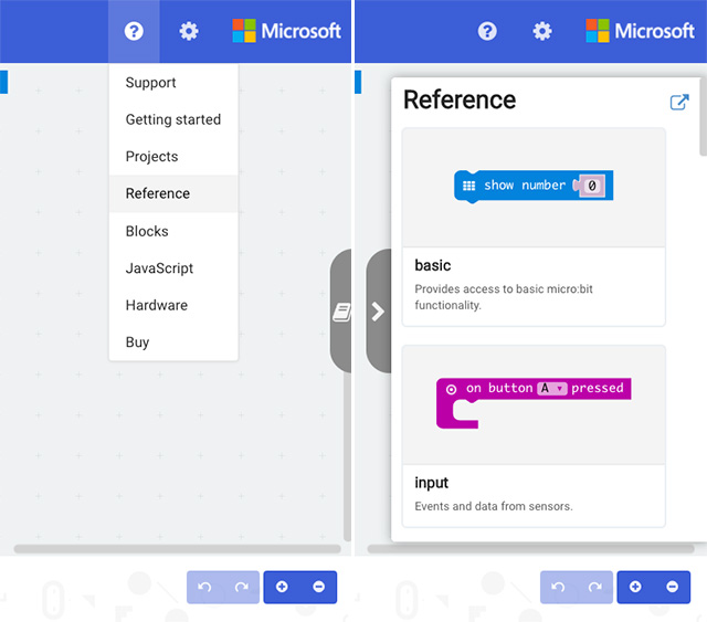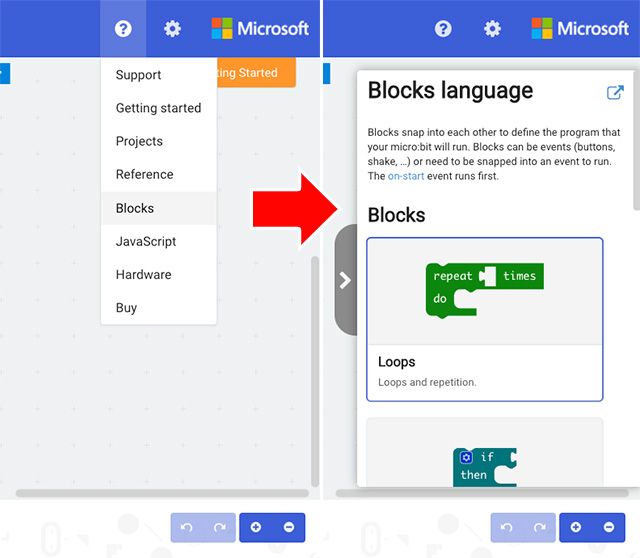 Se desiderate una spiegazione esaustiva di ogni singola istruzioni, con il computer collegato ad internet facendo click sull’icona ? in alto a destra potrete accedere alla sezione Reference oppure alla sezione Block, nel caso vogliate avere informazioni sulla singola istruzione facendo click con tasto destro del mouse avrete possibilità di accedere ad una serie di funzionalità tra cui l’Help dell’istruzione, oppure posizionando il mouse sulla singola istruzione visualizzerete un testo di spiegazione.