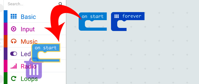 Dall’area di programmazione cancellate l’istruzioni “on start” che non servirà in questo esercizio: