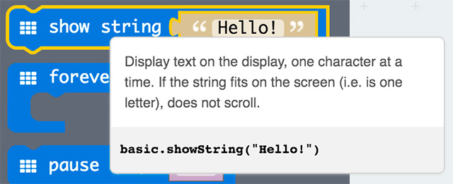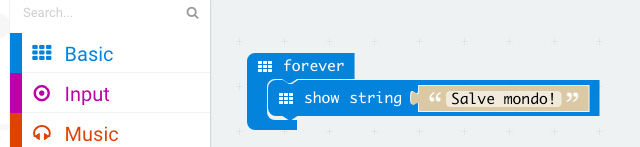 Selezioniamo dalla sezione “Basic” l’istruzione “show string Hello!” e trascinatela nell’area di programmazione all’interno dell’istruzione “forever”.