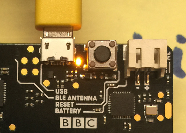 Non appena collegate la scheda al computer si accenderà il LED che segnala l’alimentazione del micro:bit collocato tra il connettore USB e il pulsante di reset: