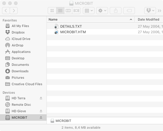 Se fate doppio click sull’icona che rappresenta il vostro micro:bit sul desktop del vostro computer, noterete che all’interno della memoria del micro:bit sono presenti solamente due file: