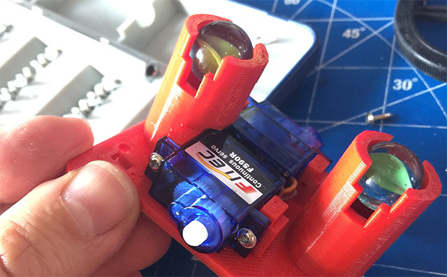 Partiamo dalla base principale, inseriamo le due biglie di vetro, sarà sufficiente una leggera pressione per incastrarle: