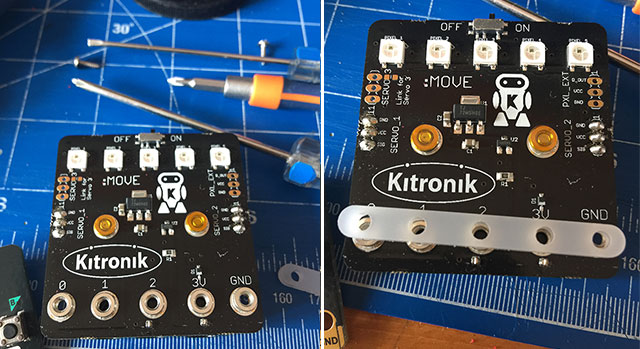 Se desiderate, per rendere semplice l’utilizzo di servomotori ed aggiungere interattività con LED RGB nell’immagine vedete una Servo:Lite board di Kitronik, ditta che produce diverse schede di espansione per micro:bit ed un piccolo robot basato su micro:bit