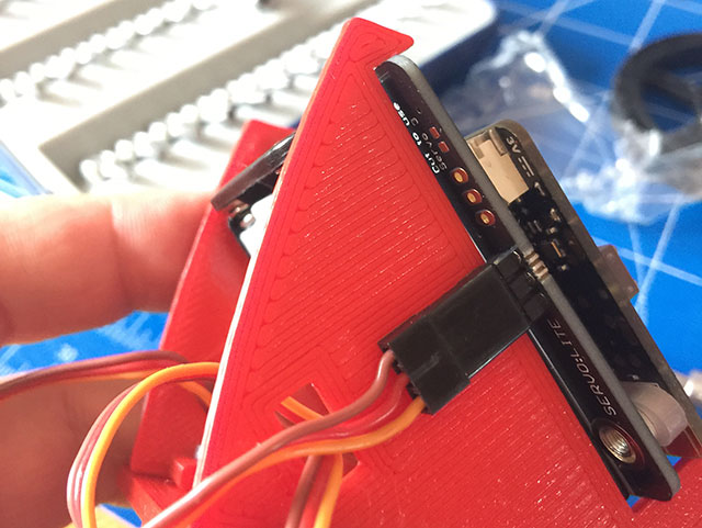 Incastrate la scheda nei supporti, sarà sufficiente spingere delicatamente e collegate entrambi i connettori dei servo così come indicato nell’immagine che segue: