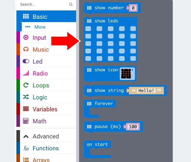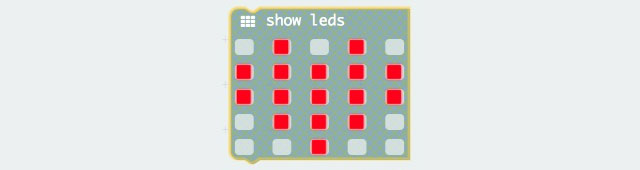 Selezionate “basic” e cercate l’istruzione “show leds”, fate click su questo comando e trascinatelo nell’area di lavoro al centro dello schermo.