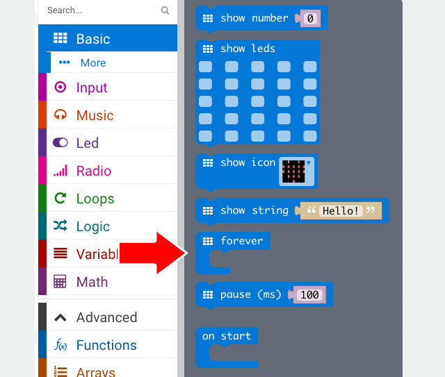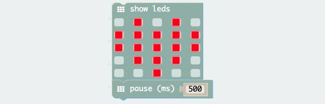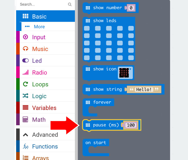 Aggiungiamo ora le istruzioni necessarie per far lampeggiare l’immagine del cuore. Selezionate “basic” e successivamente l’istruzione “pause (ms)”