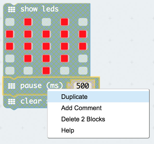 Duplichiamo l’istruzione “pause (ms)” facendo click con il pulsante destro del mouse e trasciniamo l’istruzione sotto il blocco “clear screen”: