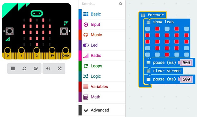 Non appena includerete tutte le istruzioni all’interno dell’istruzione “forever” vedrete funzionare il vostro programma all’interno del simulatore, il vostro cuore incomincerà ad accendersi e spegnersi.