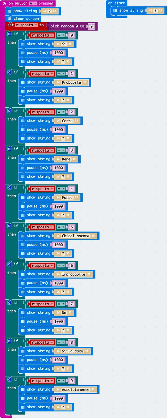 Realizzare un programma che alla pressione del pulsante “A” visualizza una risposta casuale tra N (con N che decidete voi) disponibili.