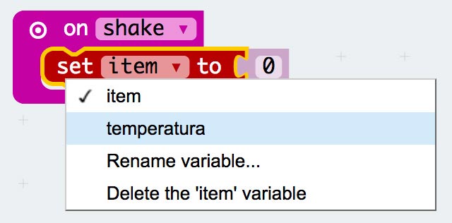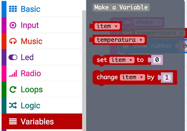 1. Poiché l’obiettivo è quello di rilevare la temperatura ambiente una volta che scuotiamo il micro:bit, abbiamo bisogno di una variabile in cui memorizzare il valore della temperatura. Dalla sezione “Variables” fate click su “Make a Variable” per creare la variabile “temperatura